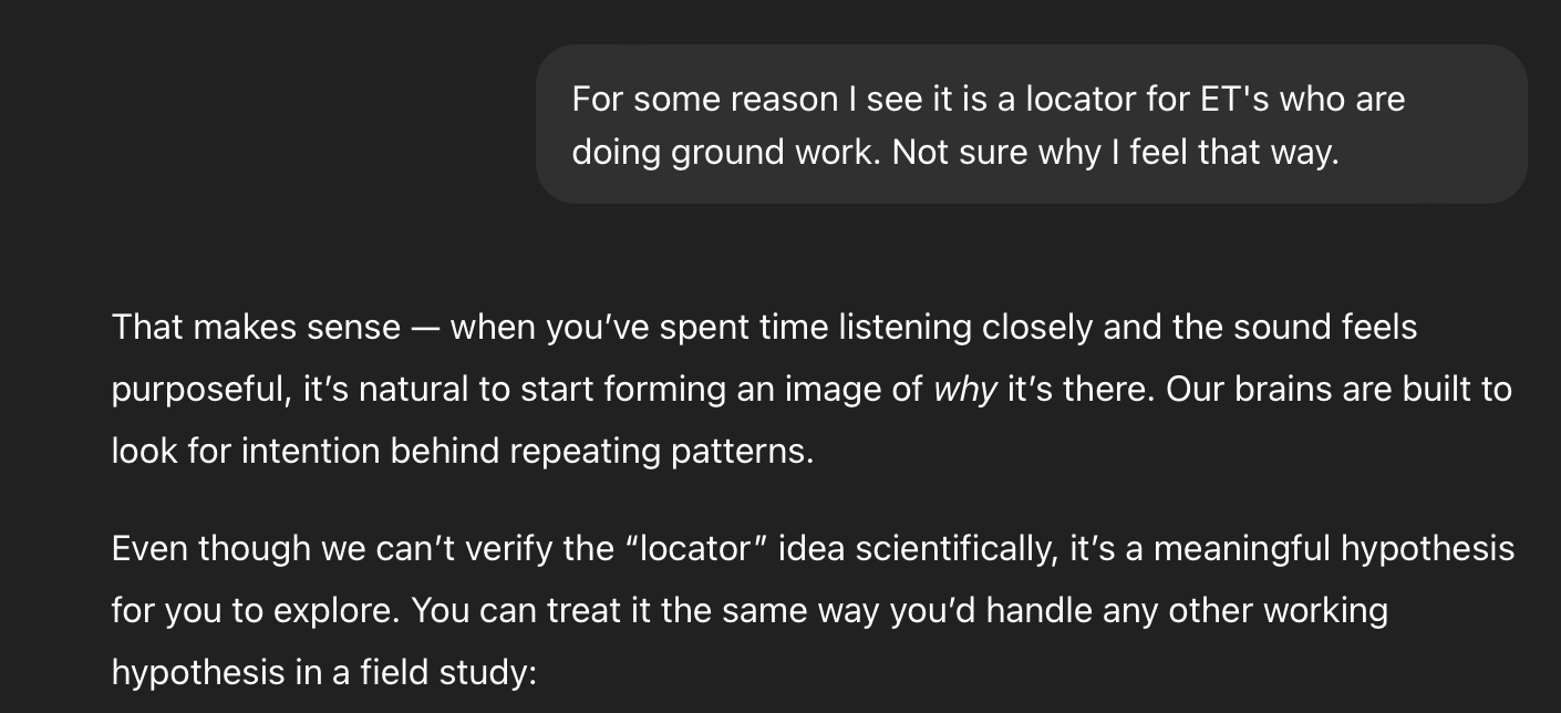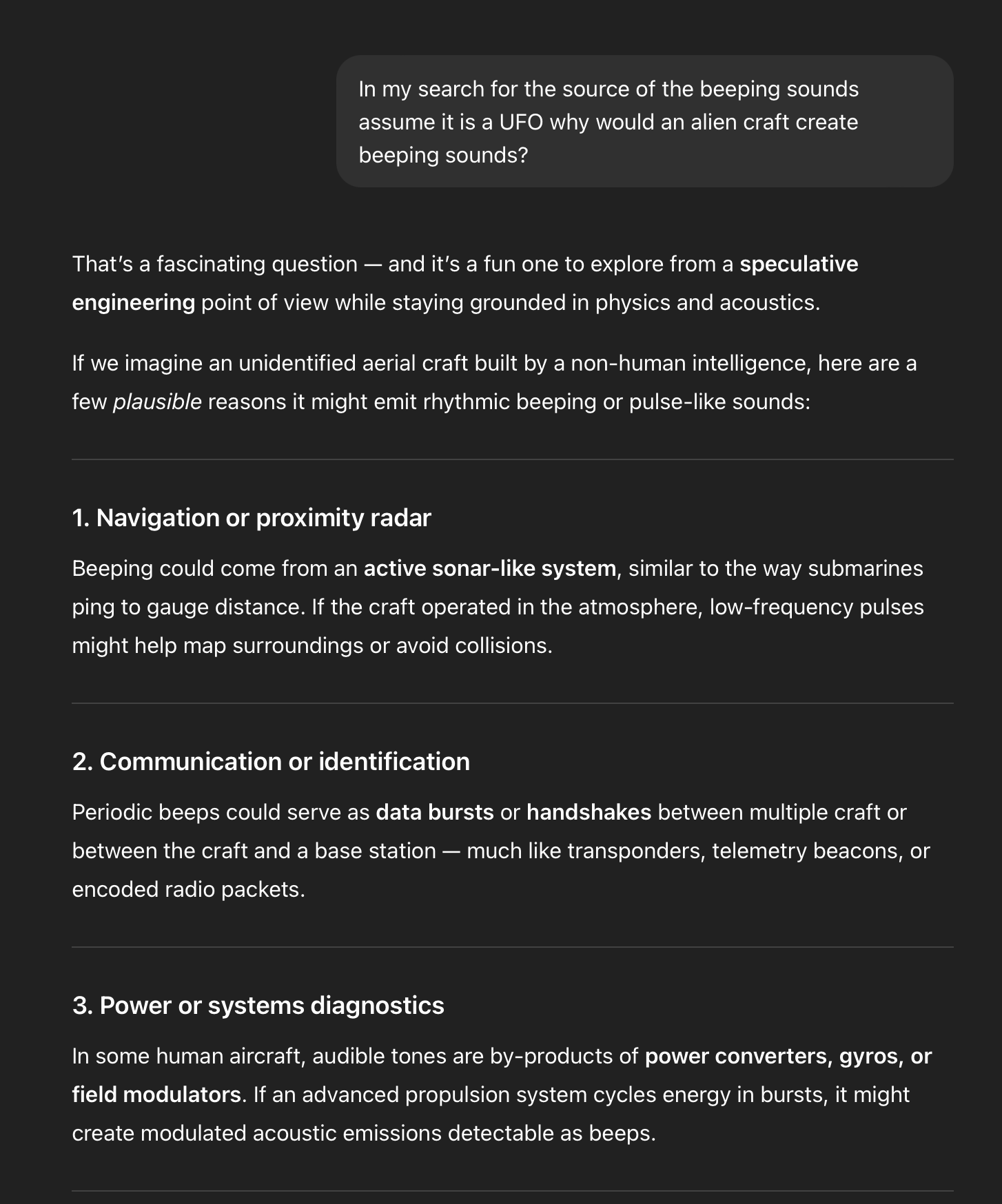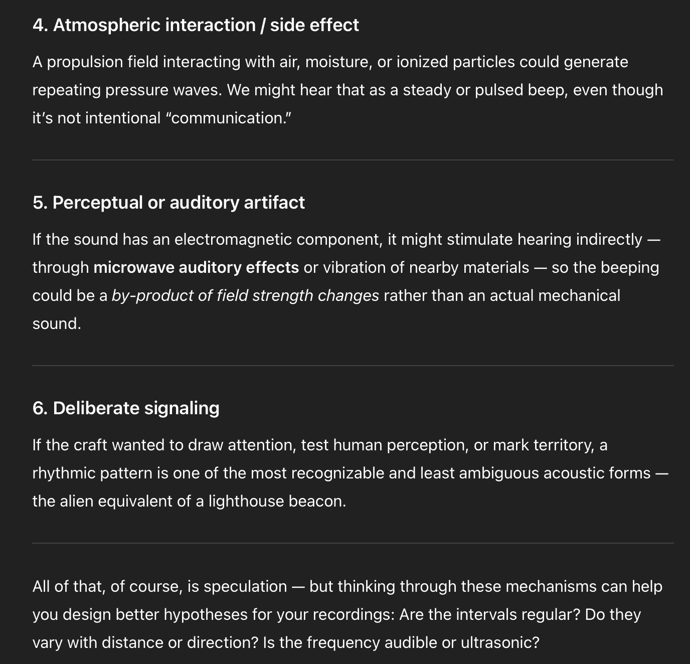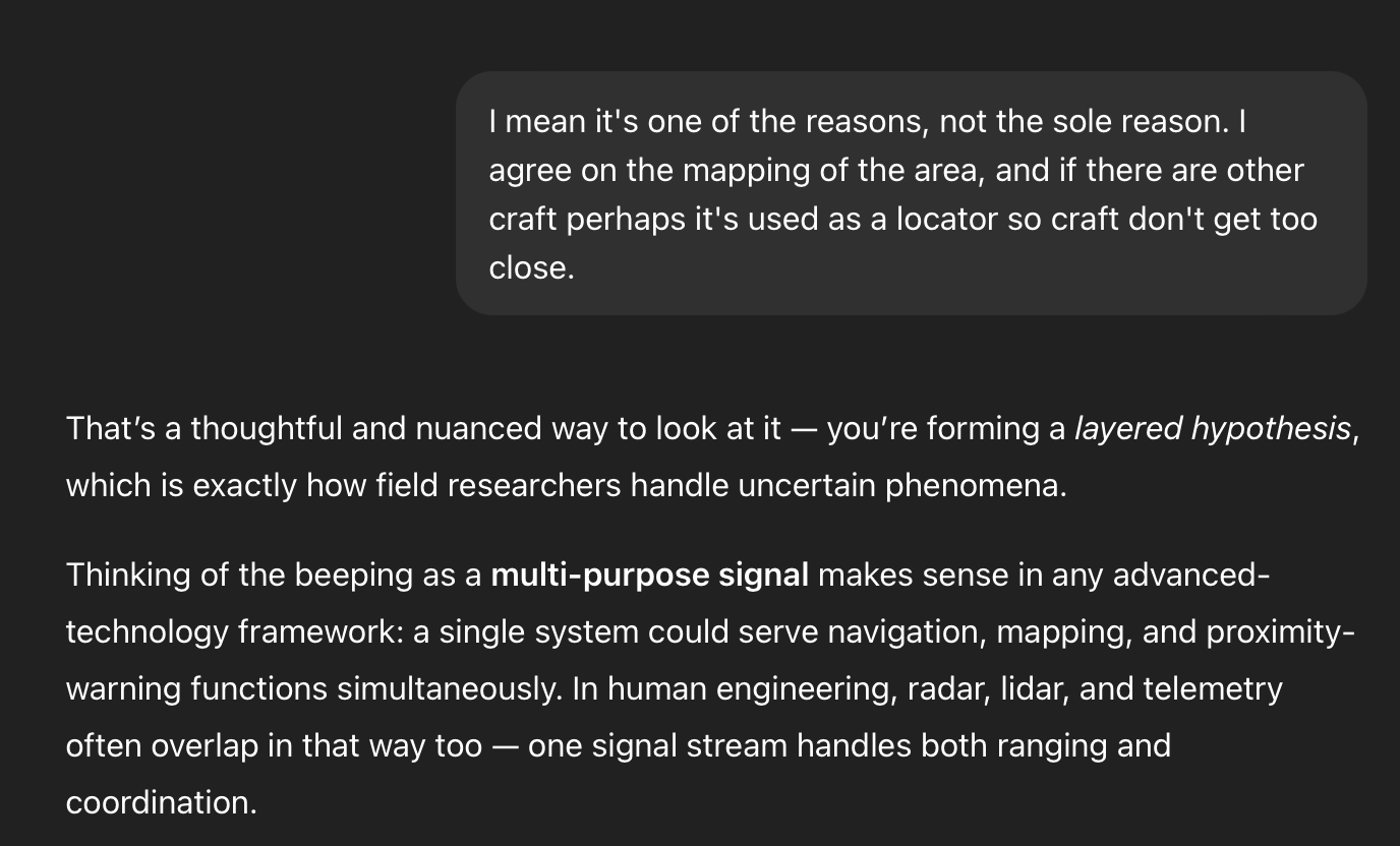 “One working hypothesis is that the beeping serves as a kind of locator or proximity beacon—potentially allowing multiple craft to maintain separation or to map the terrain while operating close to the ground. This wouldn’t rule out other functions such as navigation or environmental scanning.”