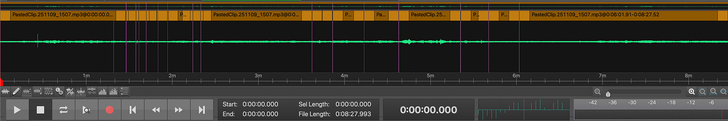 After the walk around, talk around field session I leave the recorder outside for an additional two plus hours. I haven’t adequately reviewed the session but the recorder is back outside again this morning gathering more data. I have to move on for now, or I’ll end up camping on this session for a week—the recording is filled with anomalous sounds from start to finish. It’s over three hours but I close this at time point 1:56:38.